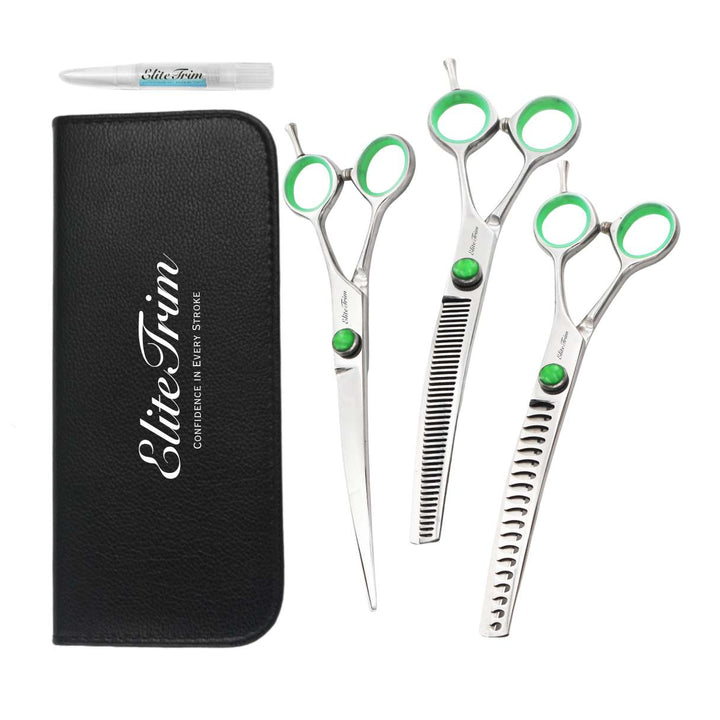 プロフェッショナルなグルーミングの精密さを体験できるEliteTrim Green‑Gem Series 7″ Dog Grooming Shears Setは、初心者から中級者のグルーマー向けに設計された高性能でコストパフォーマンスに優れたツールキットです。高品質な日本製ステンレス鋼から作られたこの4点セットの各ツールは、家庭やサロンでの清潔で安全なグルーミングのために、鋭さ、コントロール性、快適さを提供します。