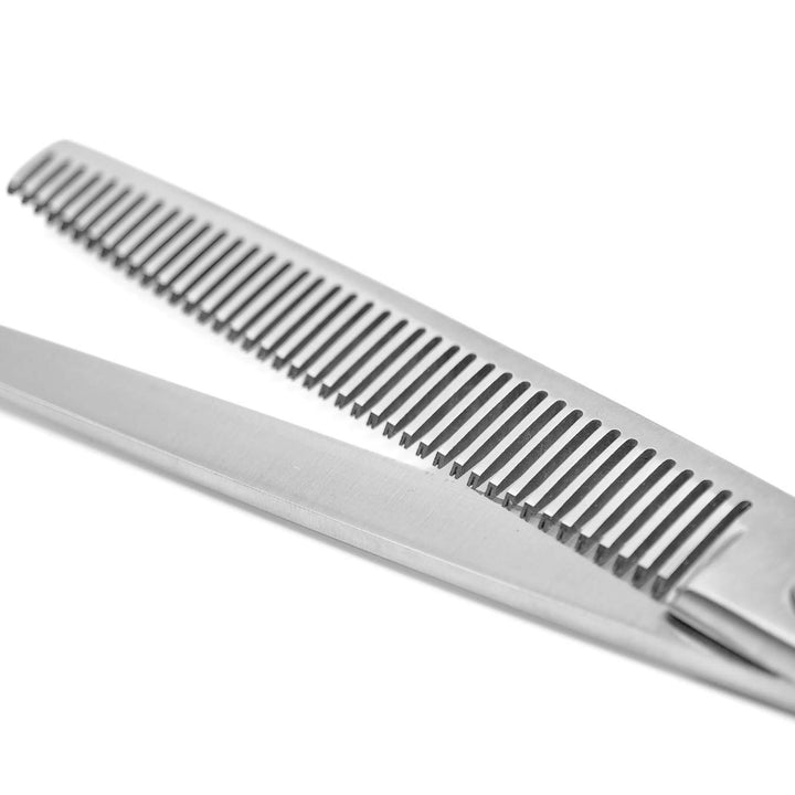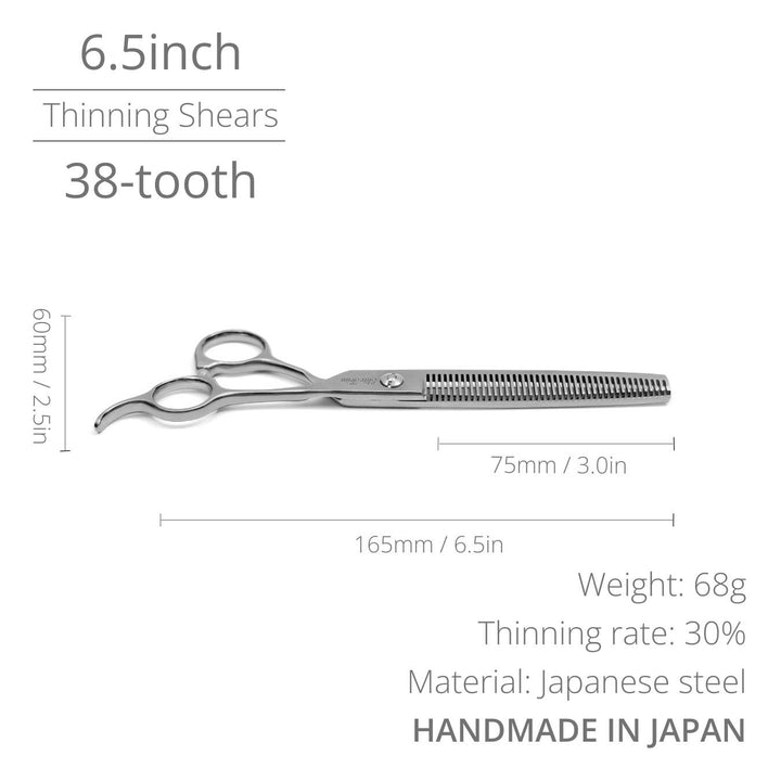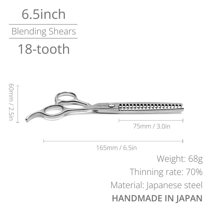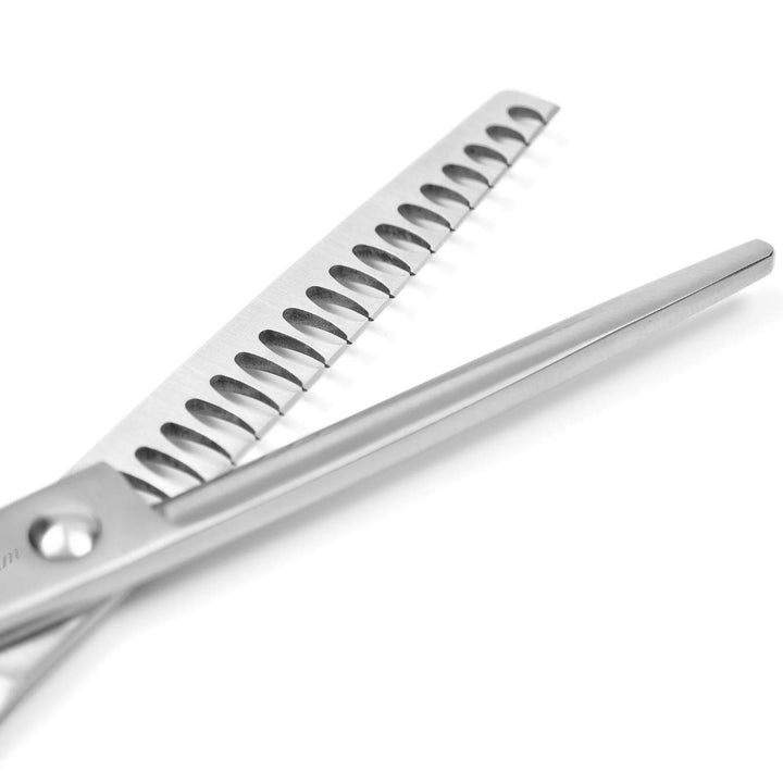 6.5インチ 左利き用チャンカー(18歯):「スピードデーモン」。1回のカットで70%の毛を除去し、ダドルやダブルコートのボリュームを素早く減らし、テクスチャーのあるふんわりしたレイヤーを作ります。