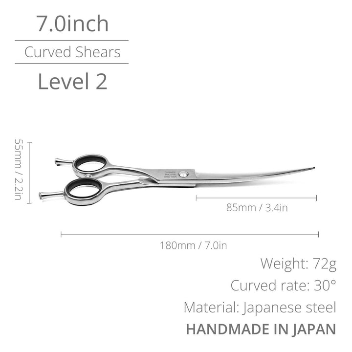 7.0インチ 左利き用カーブシザー:手首をひねらずに、丸い顔や「テディベア」ヘッド、自然な体の輪郭に沿ったカットを簡単に実現する秘密兵器です。