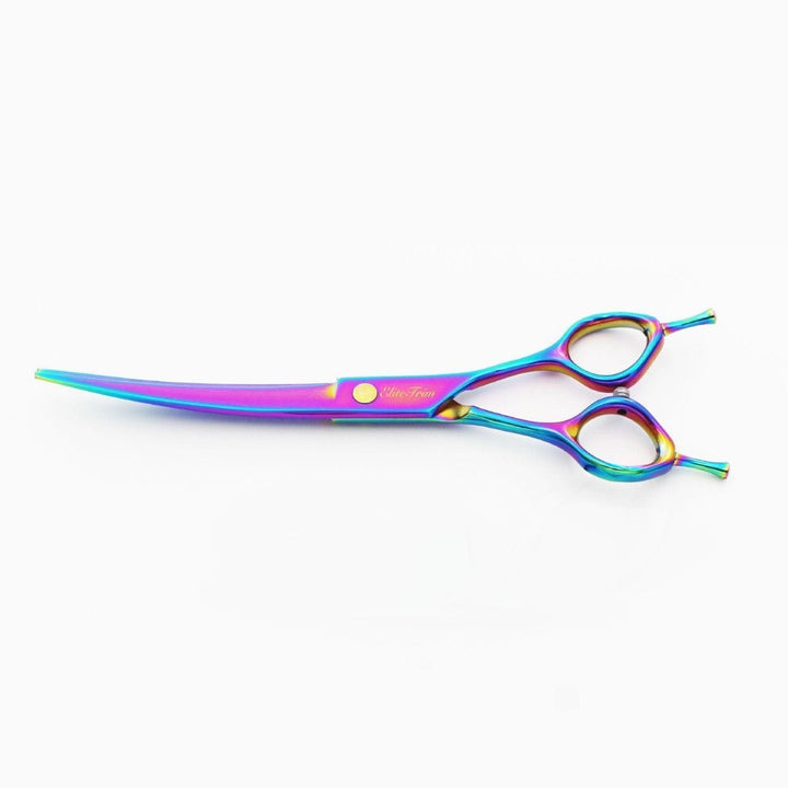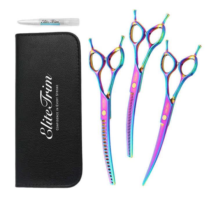 EliteTrim's Nebula 7" tynningssaks for hundestell gir salongkvalitet hjemme. De førsteklasses stålbladene med gull titanbelegg holder seg skarpe i årevis. Med doble ergonomiske fingerstøtter og mikro-sagede kanter håndterer disse saksene enkelt tykke underpels på raser som Shelties og Aussies.
