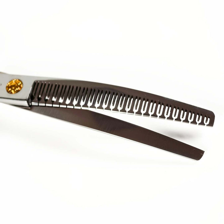 Dette er ikke en delikat finishsaks, det er en kraftig Bulk Viskelær. Med kun 24 brede tenner og en massiv 80 % fjerningsrate, er den designet for å fjerne tykke lag raskt. Men magien ligger i "Viskelær"-tennteknologien: selv om den fjerner så mye hår, etterlater den en myk, diffus kant som ser ut som den allerede er blendet.