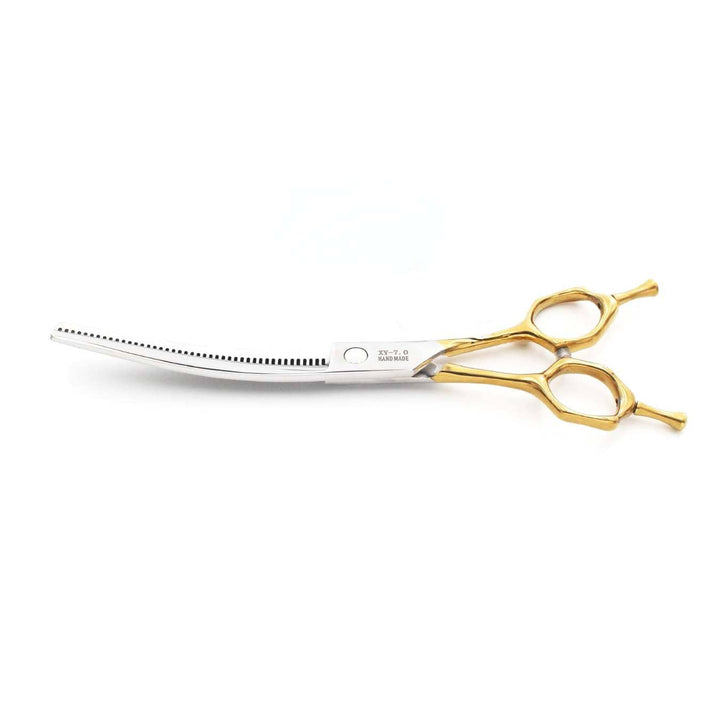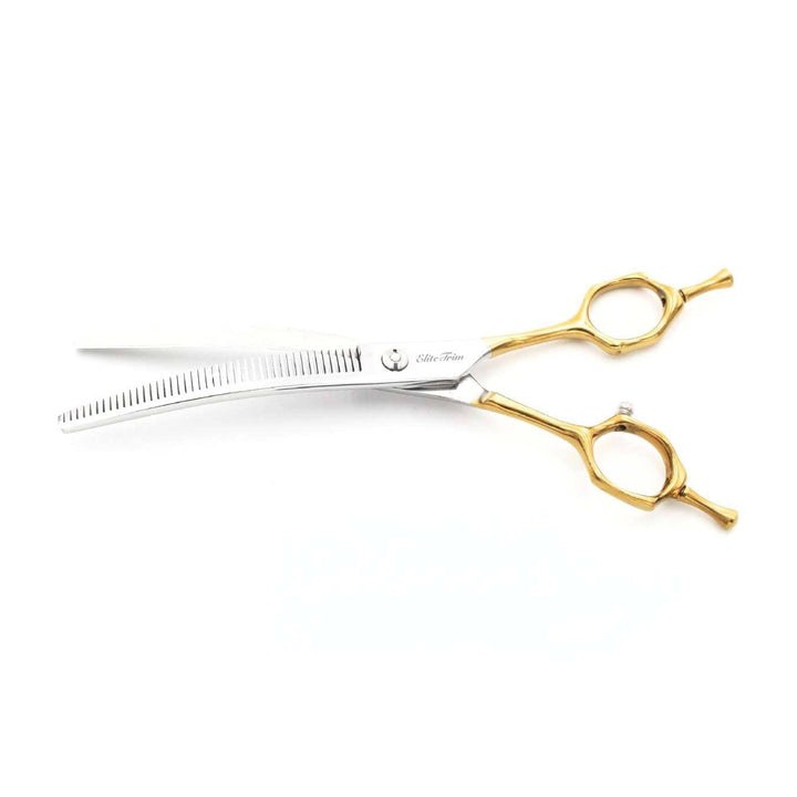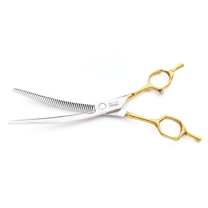 Curved thinning scissors are designed to blend and shape a dog’s coat with precision. They help create smooth, natural transitions, especially around curved areas like the head, legs, and tail without leaving harsh lines. ---